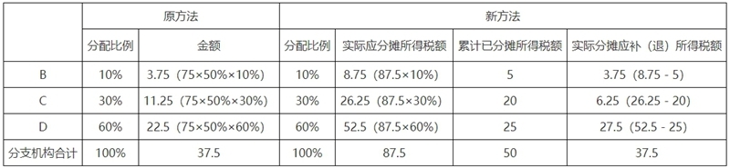 一是调整总分机构税款分摊计算方法。将汇缴环节总分机构分摊税款计算方法推广至预缴环节,即企业先对截止到本月(季)度应纳所得税额进行分摊,再由总、分机构分别抵减其已分摊预缴税款,并计算本月(季)度应补(退)所得税。举例说明如下: