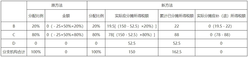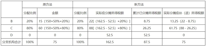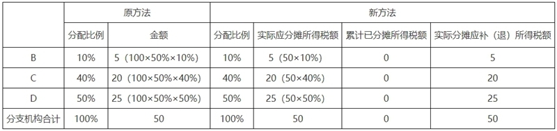 需要说明的是,汇总纳税企业如果不存在注销分支机构、分摊税款计算不准确等情形,无论按原计算方法,还是按新计算方法,结果都是一样的。但是,若汇总纳税企业前期预缴环节未准确计算分摊税款或当季发生分支机构注销情形,新计算方法将通过全量分摊方式,对全年分摊税款重新计算。案例中,由于第二季度发现第一季度C、D分支机构分配比例计算错误,在第二季度申报时按照新方法计算的C分支机构应补税额比原方法少5万元;D分支机构应补税额比原方法多5万元;B分支机构分配比例没有错误,两种方法计算结果一致。D分支机构注销后,需重新计算分配比例,在第三季度申报时按照新方法计算的B分支机构应补税额比原方法少1.75万元,C分支机构应补税额比原方法多1.75万元。