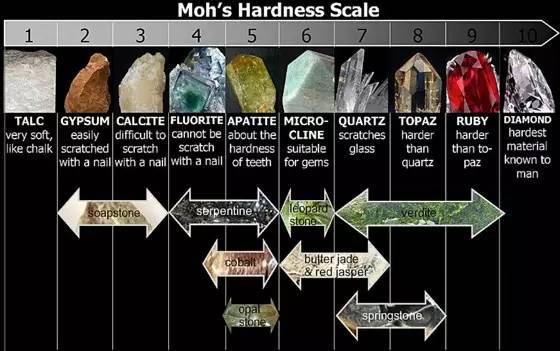 解读:这是硬度排序,另外,指甲的硬度为2.5,小刀的硬度为5.5.可以在野外利用这一特性做一初步的鉴定。这个每个学校的口号还是不一样的,有的是滑石方,莹磷长,石英黄玉刚金刚,有的更简单——滑石方萤磷,正英黄刚金。