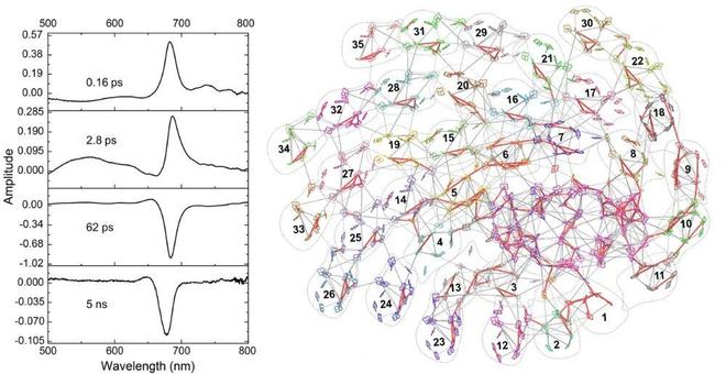 拥有如此庞大的天线,能量能否有效传递是核心问题。研究结合飞秒超快光谱与量子计算模拟发现,能量从最外围天线传递到PSI核心仅需约62皮秒,效率与体型更小的同类复合体相当。模拟显示,能量主要沿着天线蛋白“纤维”路径,通过精心排列的叶绿素分子高效汇聚至核心。这种设计保证了庞大系统内能量传输的高效性。