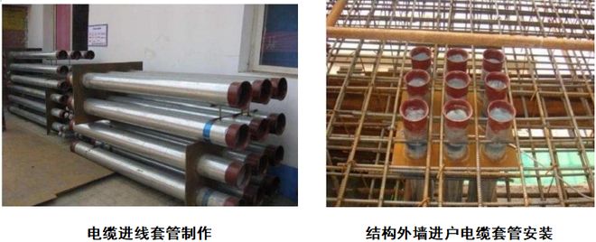 电缆进线套管制作:必须使用热镀锌钢管进行加工;套管口刷漆防腐。结构外墙进户电缆套管安装:套管标高、轴线定位准确,安装牢固。
