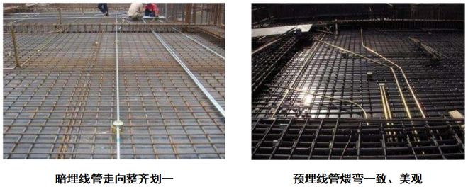 1.现浇混凝土楼板内配管在底层钢筋绑扎完成,上层钢筋未绑扎前敷设,且检查 确认,才能绑扎上层钢筋和浇捣混凝土。现浇混凝土墙体内的钢筋网绑扎完成,门、窗等位置已放线,才能在墙体内配管。